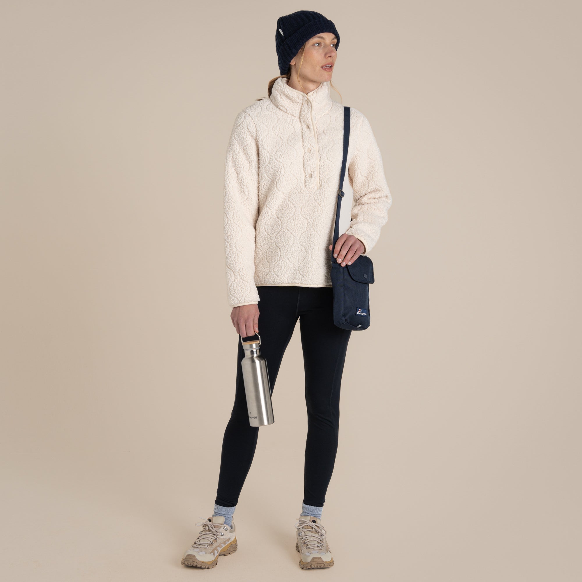 Ecru & Clay Print: 100% recycled polyester / Blue Navy: 100% polyester (75% recycled) / Trim: 100% recycled polyester
