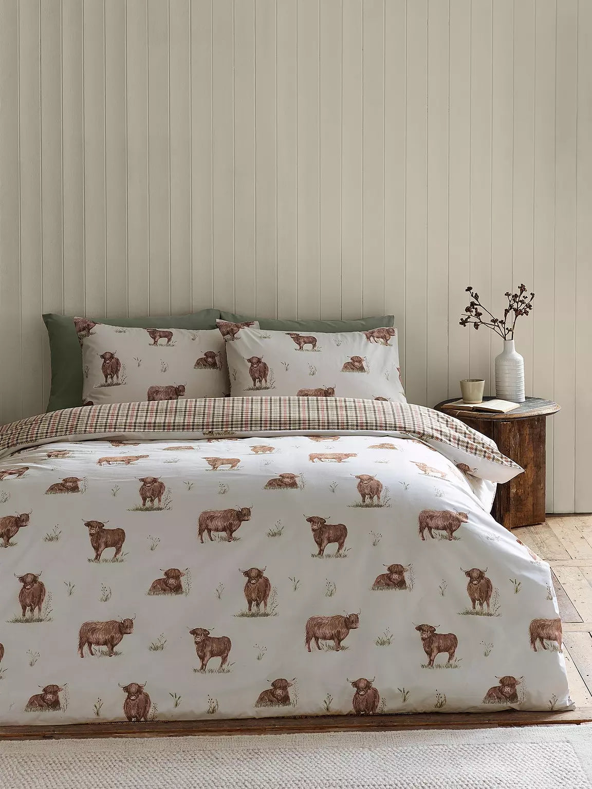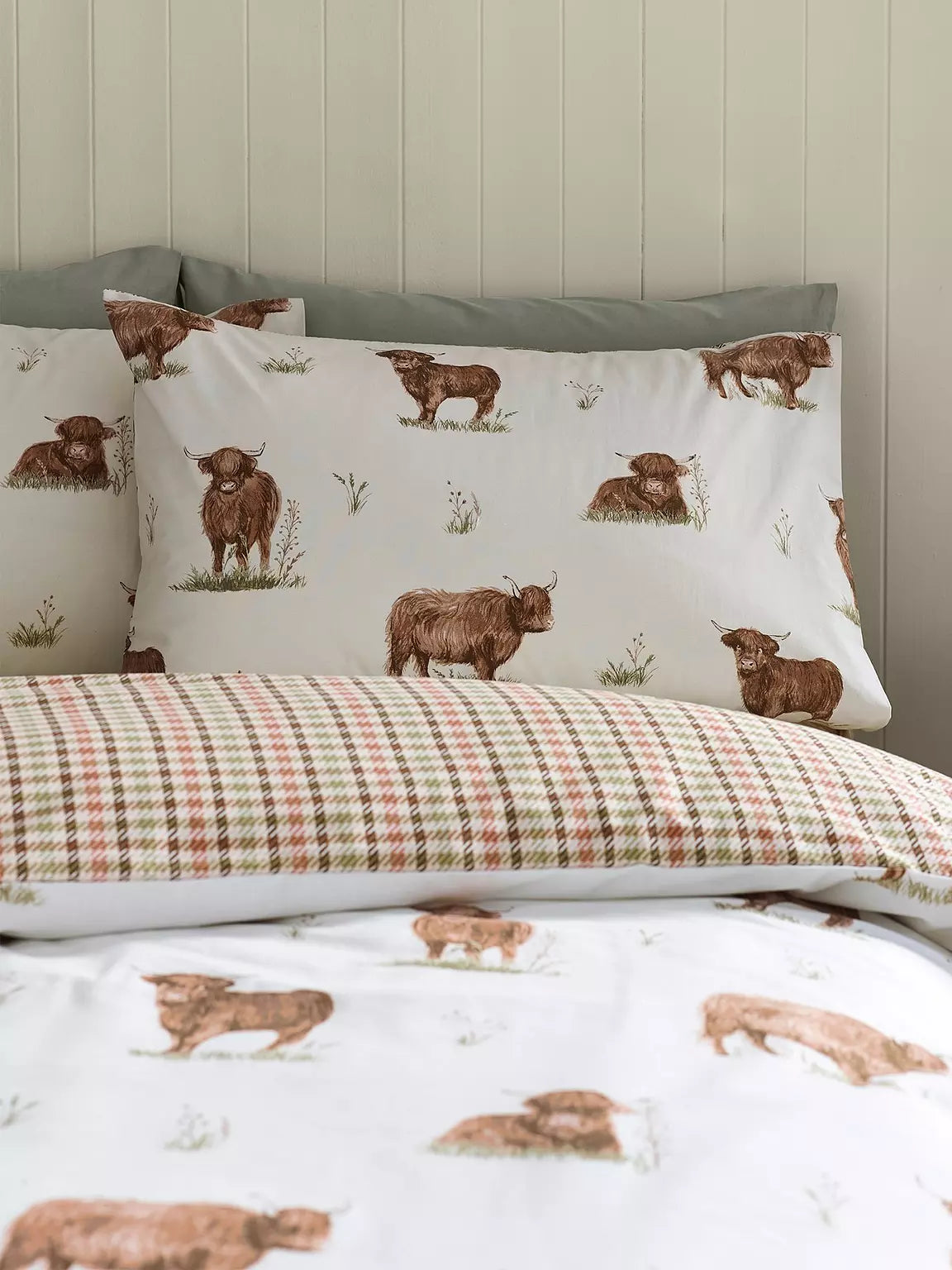 Bring rustic charm to your bedroom with the angus the highland cow. This cosy bedding set features a delightful repeat pattern of highland cows in a variety of poses, adding a touch of countryside character to your space. The reverse showcases a classic gingham design, offering a timeless look that complements the rustic theme. Created from easy-care polyester and soft cotton, blended for everyday use.