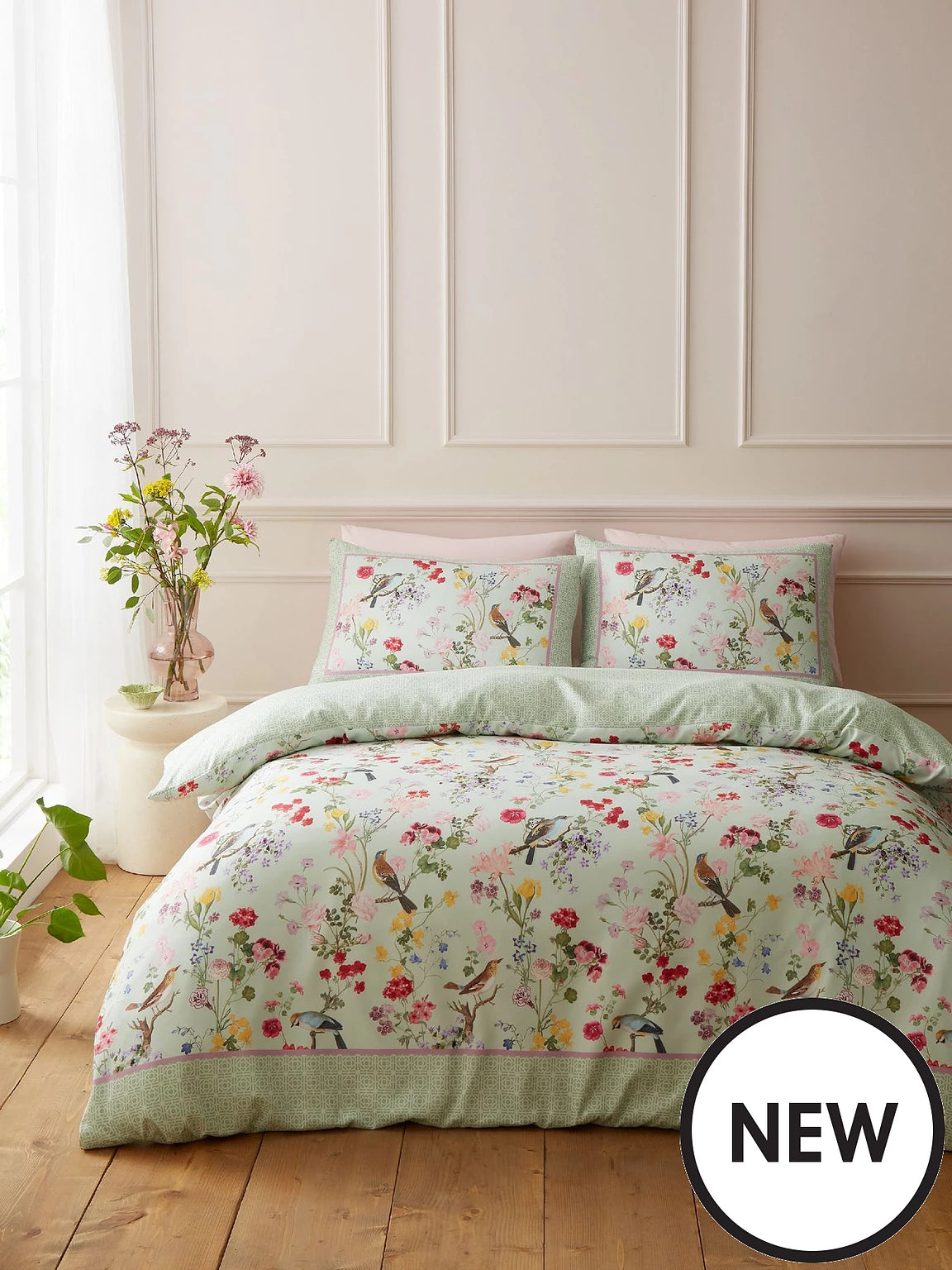 Celebrate the beauty of nature with this elegant floral bedding set, inspired by the charm of a traditional garden in full flourish. Set against a soft green ground, the design features a harmonious scatter of finely illustrated blooms intertwined with leafy sprigs and fluttering butterflies. Perched gracefully among the florals, delicate songbirds add a uplifting touch capturing the serenity of the outdoors. Digitally printed on luxuriously soft brushed microfibre, this design captures every detail with striking clarity, offering both comfort and sophistication.