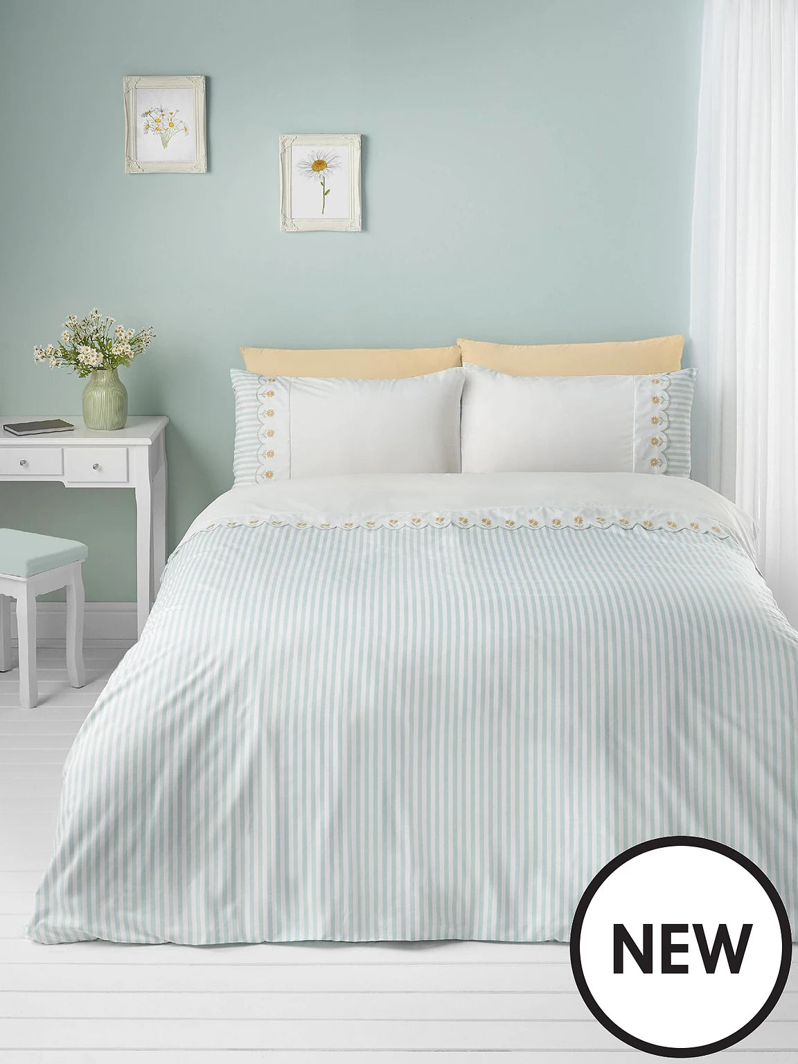 Delight in the gentle charm of this embroidered daisy bedding set, where delicate details meet cottagecore dreams. Featuring soft green pinstripes and scalloped edging, the design is beautifully finished with embroidered daisies for a touch of modern country flair. Easy care and quick to dry, this microfibre set is a time-saving and hassle-free bedding option.
