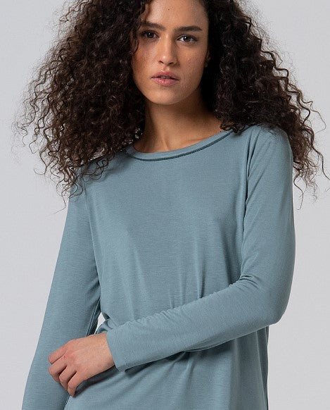 This long-sleeve ringer tee in dusty blue is designed with a classic round neckline enhanced by subtle sequins detailing, adding a refined touch to a timeless silhouette. Crafted for comfort and style, it easily elevates casual wardrobes with understated sparkle at the neckline.