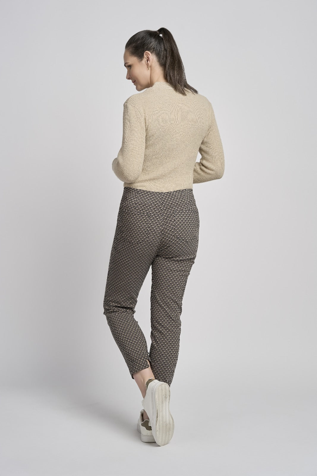 These Buttercup slim leg trousers in taupe feature a subtle geometric pattern and a stylish ankle grazer cut. Crafted from flexible Bengaline fabric, they offer a comfortable, flattering fit. A back split detail enhances mobility and adds a contemporary edge, making them ideal for professional or refined casual wear.