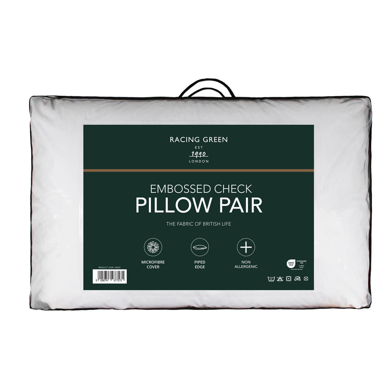 Racing Green embossed check pillow pair provides excellent comfort & support for a great night's sleep. Made with a superbly soft microfibre cover and filled with a premium silky soft hollowfibre, giving you long-lasting comfort and medium to firm support - perfect for side or back sleepers. The filling is made from 100% certified recycled polyester, and it is machine washable