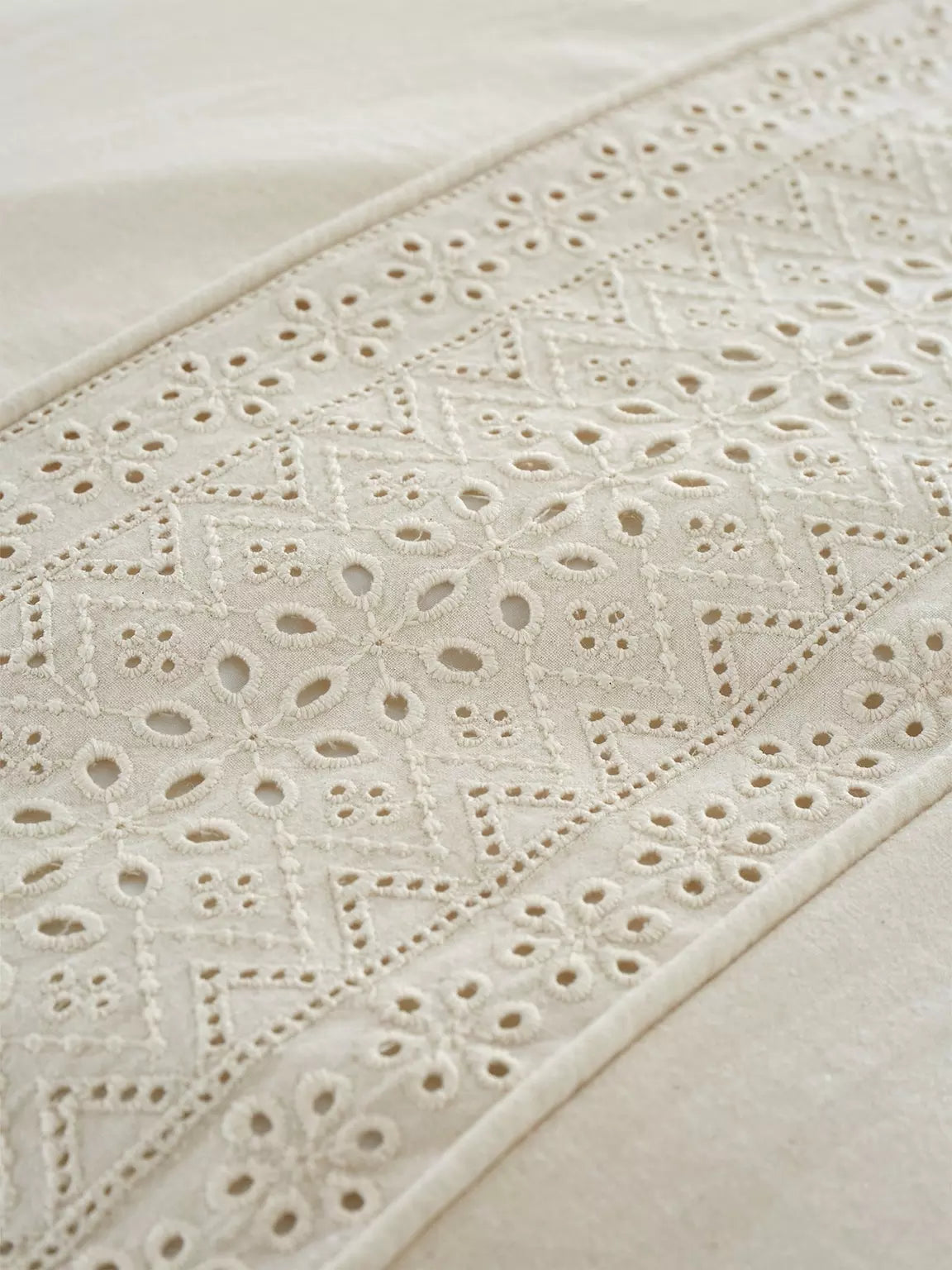 Gorgeous in an indulgent cream hue, it’s adorned with broderie anglaise detail to create a serene and sophisticated visual with roots in classic design. The set’s plain reverse is supremely soft and smooth, making it a wonderfully inviting centrepiece for a laidback setting.