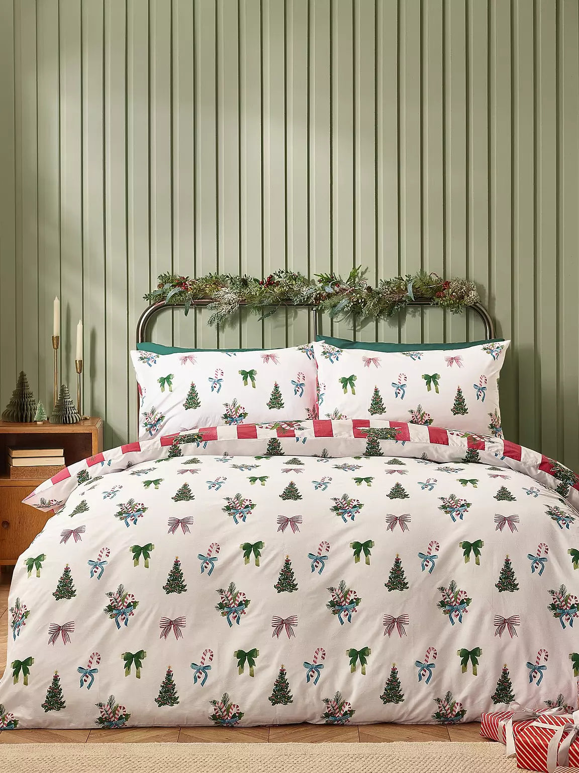 Celebrate the season in style with charming Christmas-inspired bedding. Featuring classic red and white stripes adorned with Christmas trees, candy canes, bows, and holly, this design brings a cheerful holiday charm to your space. Fully reversible with a smaller festive print on the reverse, you can enjoy you two looks in one. Created from easy-care polyester and soft cotton, blended for everyday use during the holiday season.ÃÂ