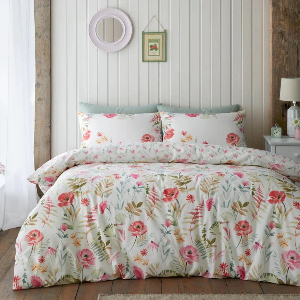 Experience a fusion of elegance and comfort with the Ella Poppy Cream Quilt Set This vibrant bedding set, with its colorful floral pattern, breathes life into any bedroom decor. Crafted from a smooth cotton blend, it offers the perfect balance of softness and breathability, ensuring a restful night's sleep. The intricate floral motifs add a touch of sophistication, while the reversible design enhances versatility. This quilt set, including a duvet cover and matching pillowcases, is not just a bedding set, it's an upgrade to your bedroom aesthetics.