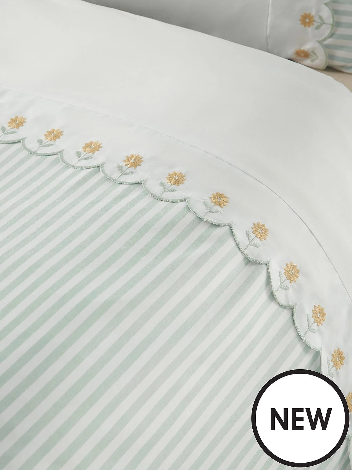 Delight in the gentle charm of this embroidered daisy bedding set, where delicate details meet cottagecore dreams. Featuring soft green pinstripes and scalloped edging, the design is beautifully finished with embroidered daisies for a touch of modern country flair. Easy care and quick to dry, this microfibre set is a time-saving and hassle-free bedding option.