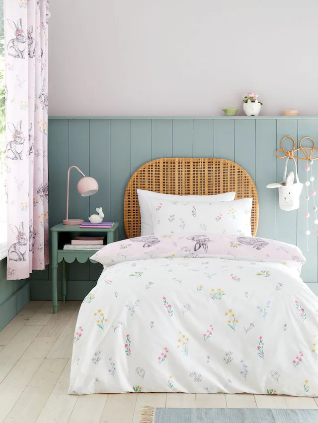 Hop into bedtime bliss with this playful bunnies and blossom design. Fully reversible, with a ditsy floral twist for those who like to change it up. Bedtime just got extra adorable – let the bunny adventures and floral dreams begin. Easy to Care: Suitable for machine washing and tumble drying. Fully Reversible: For two stylish looks in one. Button Fastening: To keep your duvet securely in place. Envelope Closure: Providing a secure and snug fit for your pillow.