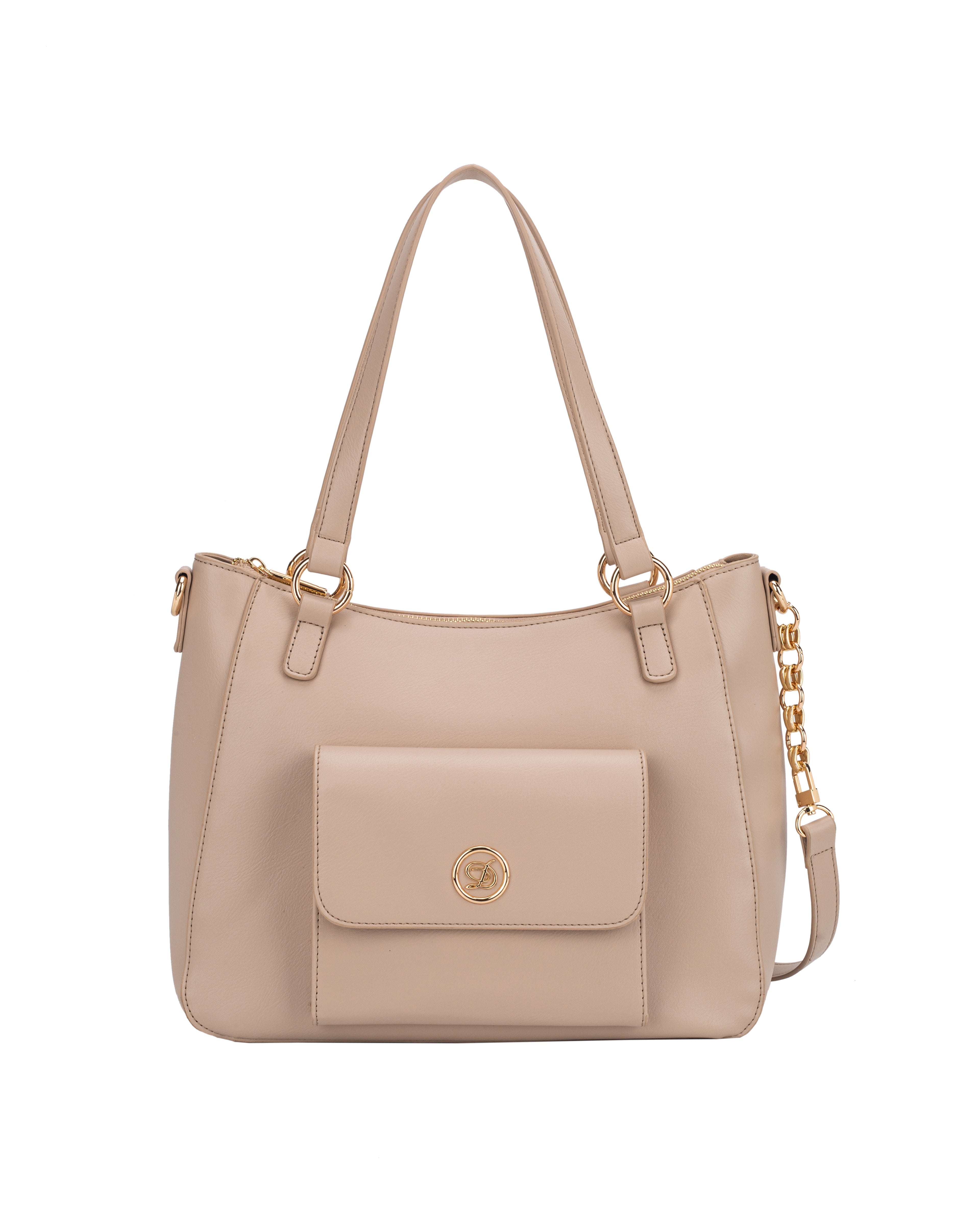 The Aspen Front Pocket Bag in natural offers ample space with a large main compartment complemented by a prominent square front pocket for easy access to essentials. Enhanced with elegant gold chain detailing, this bag blends functionality with a touch of sophistication, making it ideal for those who value both practicality and refined style.