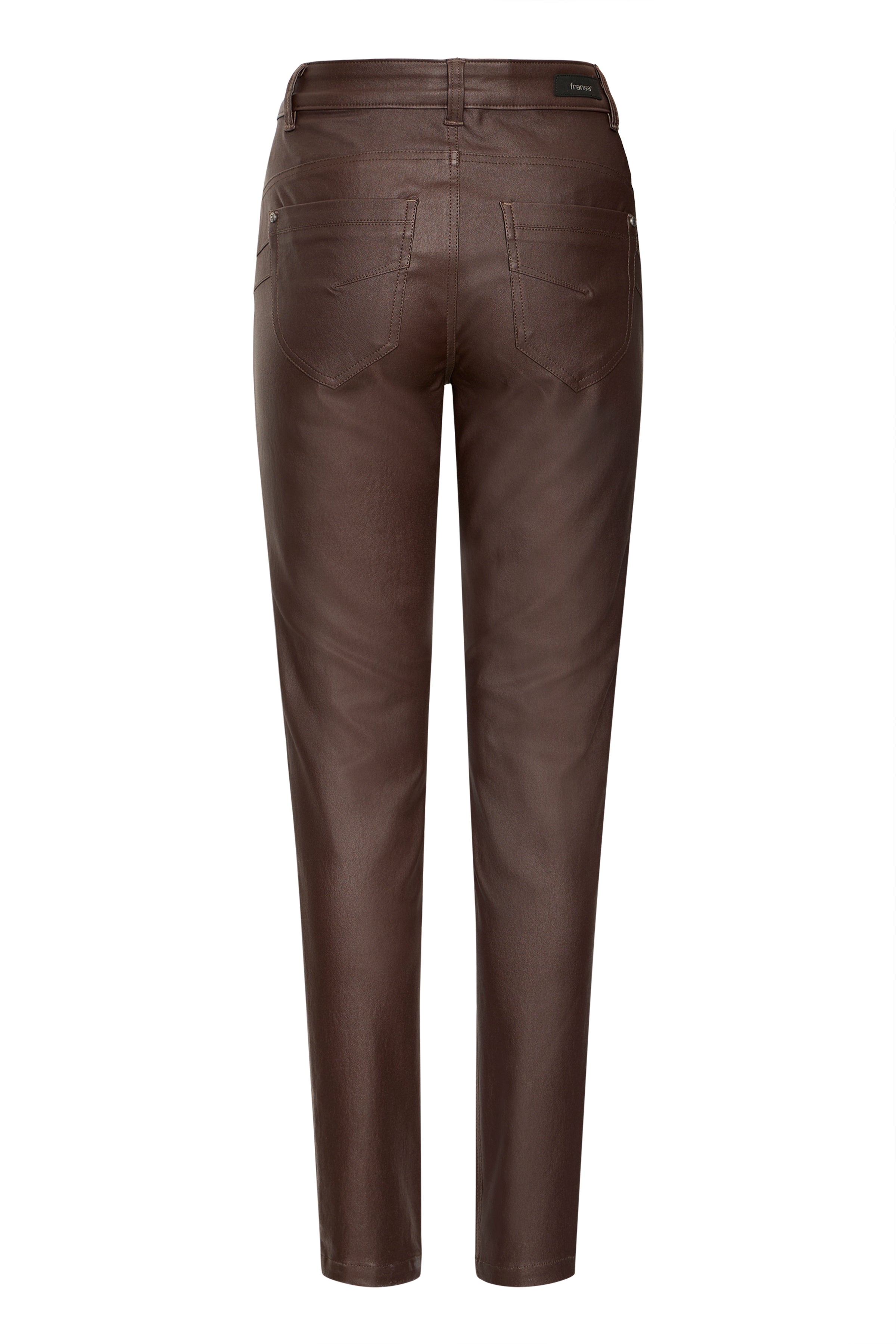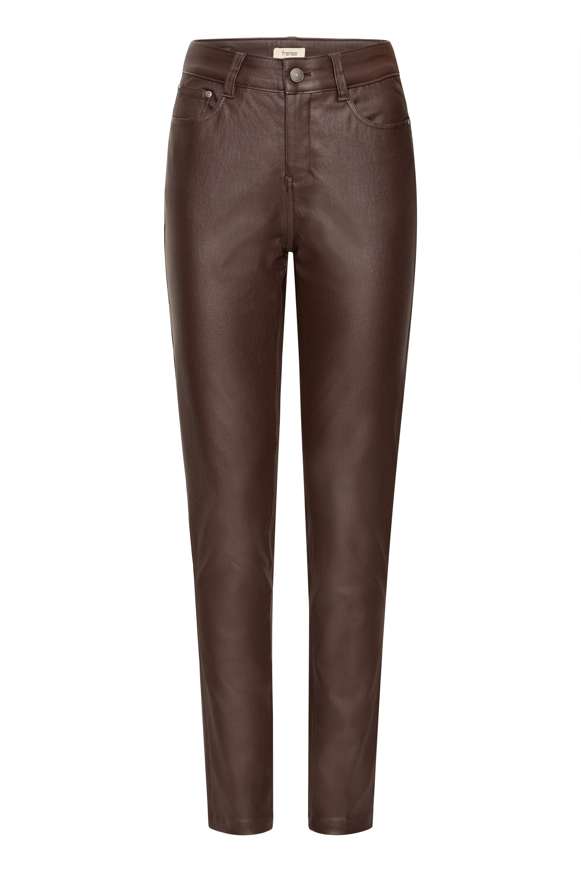 These Malin Trousers in rich chocolate faux leather offer a sleek, dressy look with their skinny leg design. Perfect for making a sophisticated statement, they hug the silhouette to enhance shape while delivering a sexy, modern edge suitable for both evening events and stylish daywear.