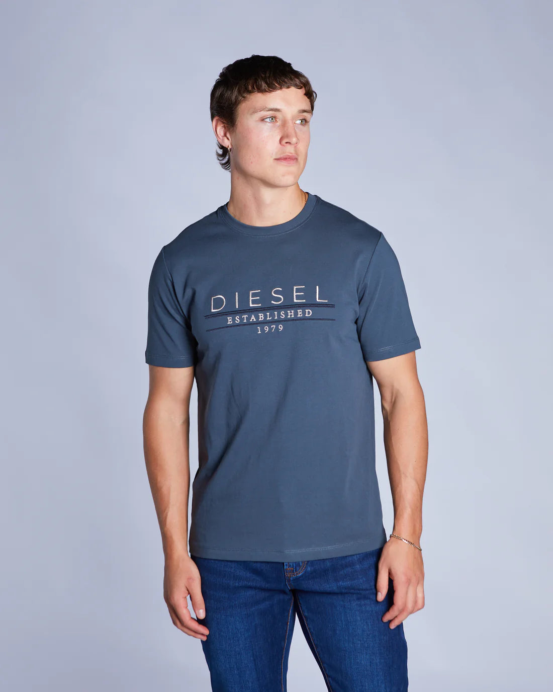 The Duncan Tee in Petrol Blue features a classic ringer design with a bold, large Diesel logo on the chest, offering a timeless yet striking look. Crafted for comfort and style, it pairs effortlessly with casual wardrobes, making it a versatile staple for those who appreciate quality branded apparel.