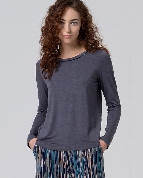 This long-sleeve ringer tee is designed with a classic round neckline enhanced by subtle sequins detailing, adding a refined touch to a timeless silhouette. Crafted for comfort and style, it easily elevates casual wardrobes with understated sparkle at the neckline.
